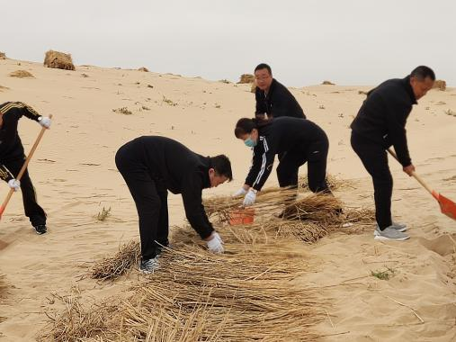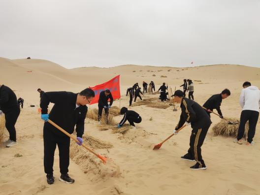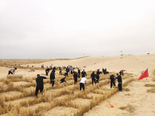 在此起彼伏的沙丘上,人社系统党委的旗帜迎风飘扬,党员干部们干劲十足、手拿铁锹、铁铲等工具,迅速投入到防风治沙的行动中。有的划线开沟、有的搬运铺放稻草、有的掩盖沙土压实,分工明确、井然有序。在活动中,领导干部发挥头雁的作用,先行先试;党员干部争先恐后,你追我赶,一名党员一面旗帜得到生动的体现。经过大家共同的努力,一个个“草方格”规整有序,徐徐展现在眼前,缓缓向沙地的远方延伸,为广褒的沙漠增添了无限生机,为植绿创造了机遇,为检验人社系统组织力、凝聚力和向心力提供了崭新的平台。