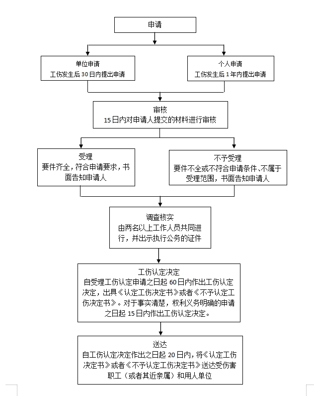 受理条件 职工发生事故伤害或者按照职业病防治法规定被诊断、鉴定为职业病,所在单位应当自事故伤害发生之日或者被诊断、鉴定为职业病之日起30日内,向社会保险行政部门提出工伤认定申请。 用人单位未按前款规定提出工伤认定申请的,工伤职工或者其近亲属、工会组织在事故伤害发生之日或者被诊断、鉴定为职业病之日起1年内,可以直接向社会保险行政部门提出工伤认定申请。 1.应当认定为工伤的情形: (1)在工作时间和工作场所内,因工作原因受到事故伤害的; (2)工作时间前后在工作场所内,从事与工作有关的预备性或收尾性工作受到事故伤害的; (3)在工作时间和工作场所内,因履行工作职责受到暴力等意外伤害的; (4)患职业病的; (5)因工外出期间,由于工作原因受到伤害或者发生事故下落不明的; (6)在上下班途中,受到非本人主要责任的交通事故或者城市轨道交通、客运轮渡、火车事故伤害的; (7)法律、行政法规规定应当认定为工伤的其他情形 2、视同工伤的情形: (1)在工作时间和工作岗位,突发疾病死亡或者在48小时之内经抢救无效死亡的; (2)在抢险救灾等维护国家利益、公共利益活动中受到伤害的; (3)职工原在军队服役,因战、因公负伤致残,已去的取得革命伤残军人证,到用人单位后旧伤复发的。
