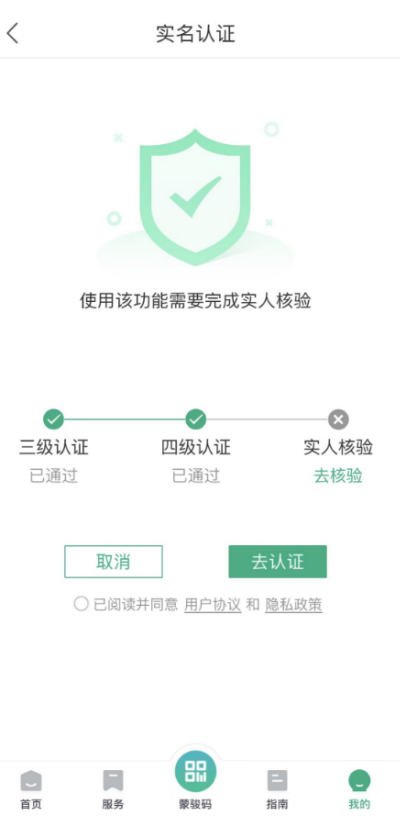 个人用户首次使用“电子印章”服务,点击“一键申领印章”,阅读“电子签名服务告知”,点击“同意”进行实人核验,实人核验通过后跳转至数字证书激活界面,输入当前登录蒙速办移动端手机号码获取的短信验证码、设置数字证书保护口令(用户设置,后续扫码签章等过程会校验证书保护口令),点击“激活”功能完成数字证书下载与个人印章申领;