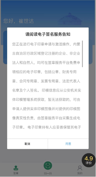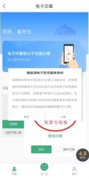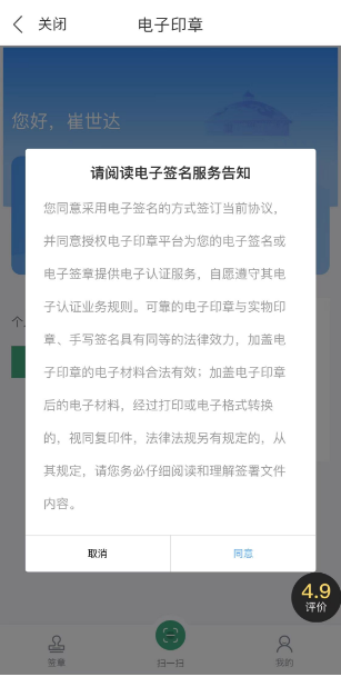 点击屏幕下方“扫一扫”功能,阅读“电子签名服务告知”,点击“同意”进行实人核验,核验通过后扫描由业务专区生成的签署二维码,“同意授权”校验数字证书密码进行文件签署印章授权: