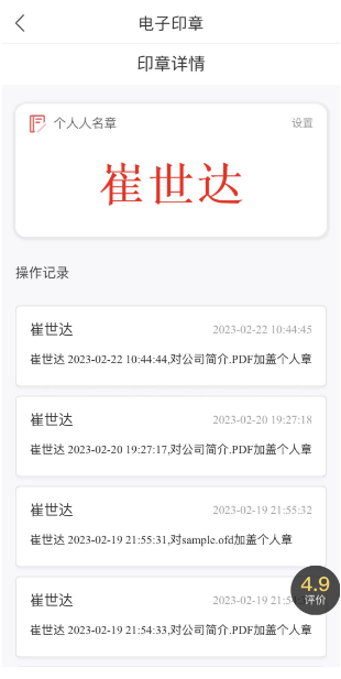 印章下方的“操作记录”列表中展示了印章操作记录,展示了电子印章使用记录,包含:使用人、文件签署时间、签署文件名称等信息: