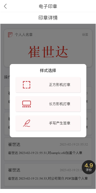 点击“查看”,人名章下方的“操作记录”列表中,展示了电子印章使用记录,包含:使用人、文件签署时间、签署文件名称等信息;点击右上角“设置”,可以选择“正方形机打章”、“长方形机打章”和设置“手写产生签章”样式: