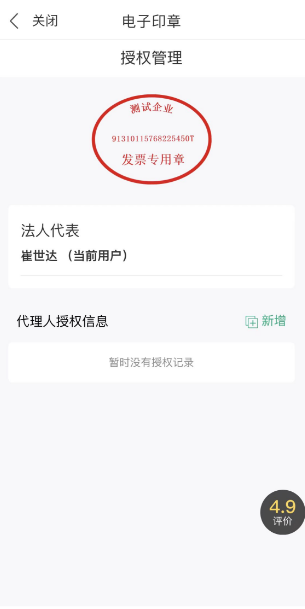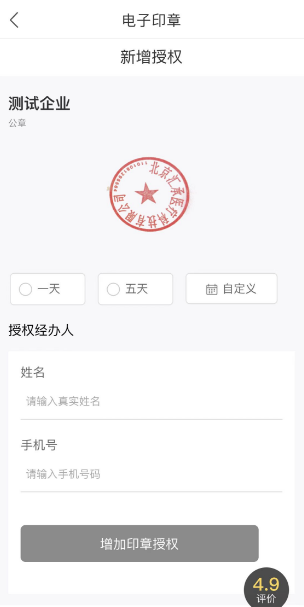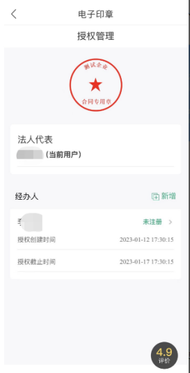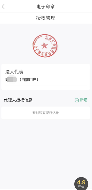 点击“授权”,进行实人核验,实人核验通过后法人可以授权代理人用章的权限,点击“新增”,选择或自定义印章授权时间,录入代理人姓名、手机号码继续进行印章授权: