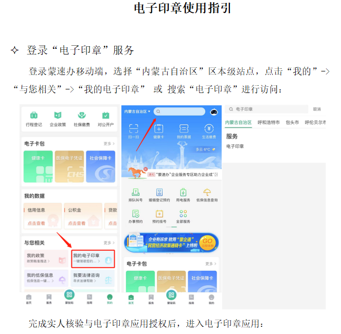 点击“电子印章使用指引”,查看蒙速办移动端电子印章使用操作流程: