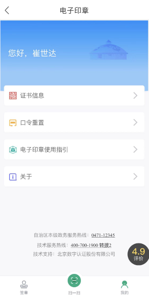 点击右下角“我的”按钮,“证书信息”中可以查看证书的签发信息、“口令重置”中可以对数字证书密码重新设置、“电子印章使用指引”中描述了蒙速办移动端电子印章服务的使用过程,“关于”中记录了系统服务版本等信息: