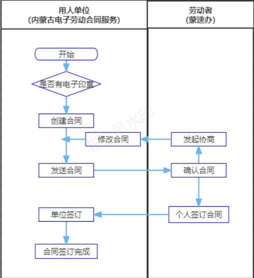 劳动者签订劳动合同后,用人单位操作合同签订,包括通过“电子劳动合同服务平台”点选合同和通过“蒙速办APP”盖章两步操作。