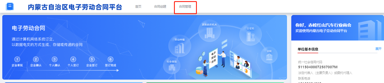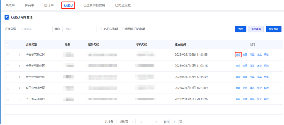 顶部菜单栏,点击【合同管理】,查看不同流转状态的劳动合同,进行系统操作。