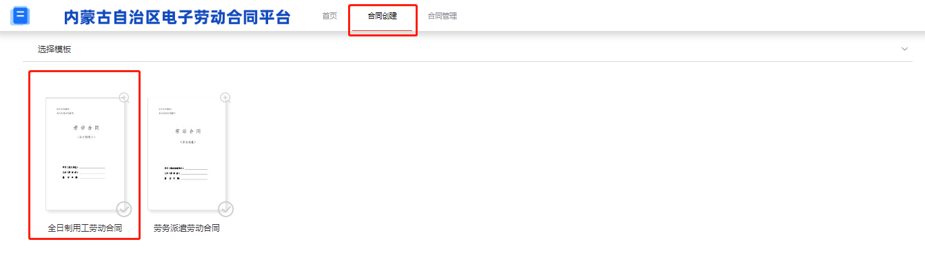 第一步:在顶部菜单栏,点击【合同创建】,选择合同模板。