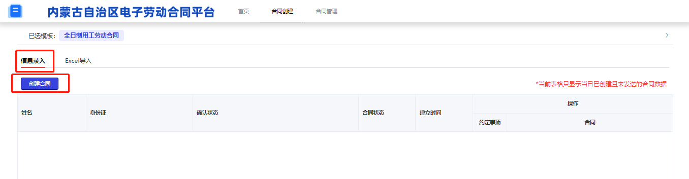 选择【信息录入】,点击【创建合同】,填写合同详细信息。