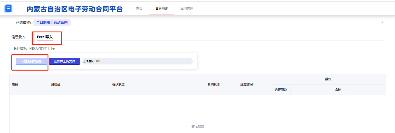 第一步:选择【Excel导入】,点击【下载该合同模板】。