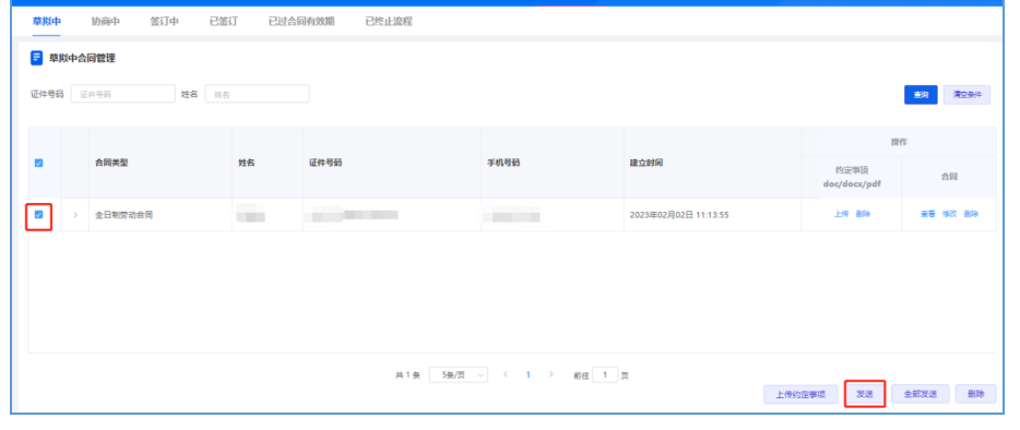 【草拟中】:是指用人单位创建劳动合同后,发送给劳动者之前的合同状态;用人单位可对草拟中的合同进行修改、删除、上传约定事项或发送、批量发送操作。