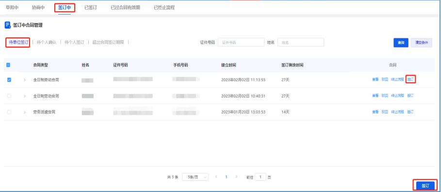 勾选多个劳动合同时,需点击页面右下角的“签订”按钮,进行批量合同签订。