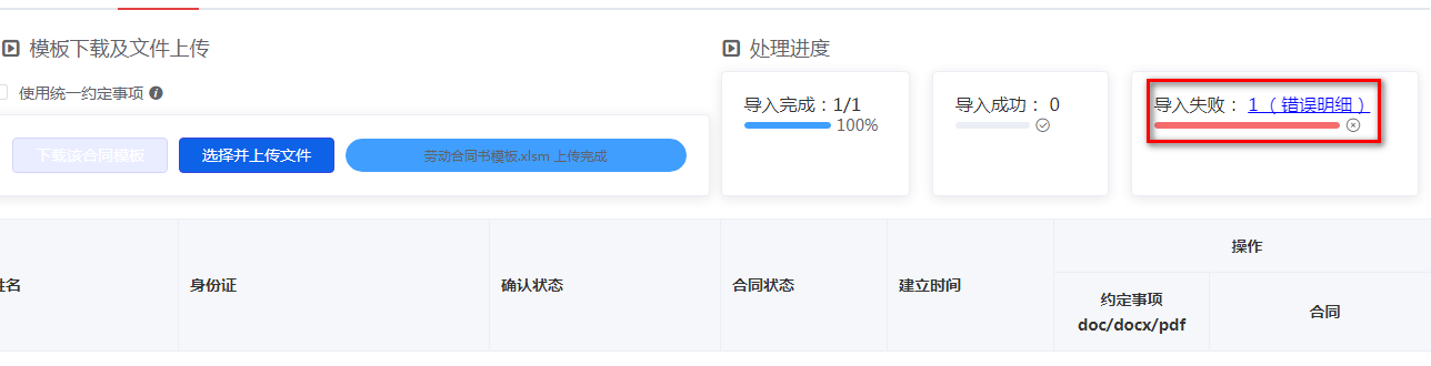 若导入失败,可以在【导入失败:错误明细】查看失败原因,根据错误明细修改合同信息后,重新上传。