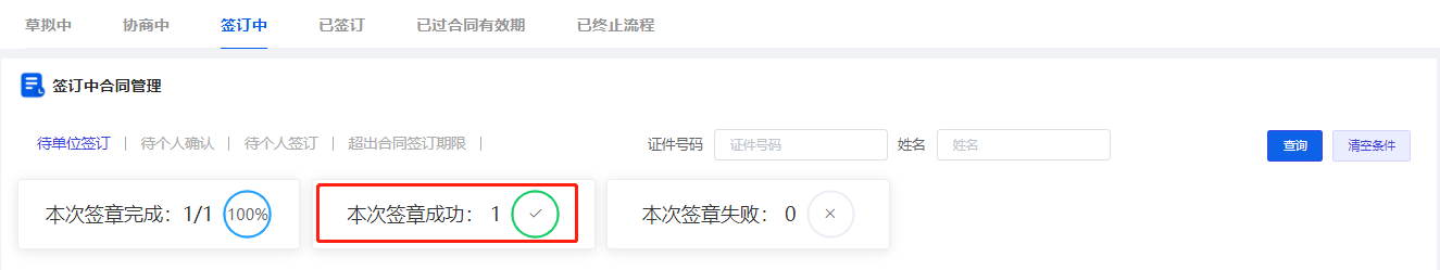 【签订中】:依次包括“待个人确认”、 “待个人签订”、“待单位签订”、 “超出合同签订期限”4个详细状态;用人单位可点击查看具体合同信息,对“待单位签订”的合同进行驳回、签订或终止合同流程操作。