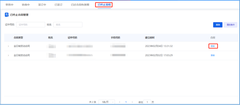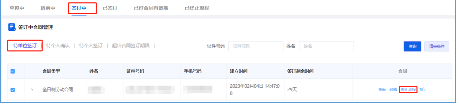 【已终止流程】:签订双方在签署过程中可点选终止合同签署,终止后,合同作废。系统支持用人单位对合同进行查看操作。