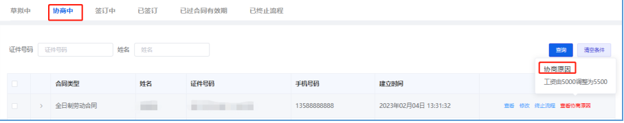 【协商中】:是指用人单位发送劳动合同后,劳动者确认合同前,对合同条款有异议,劳动者发起的协商操作;用人单位可对协商中的合同查看协商原因、修改合同或选择终止合同流程。